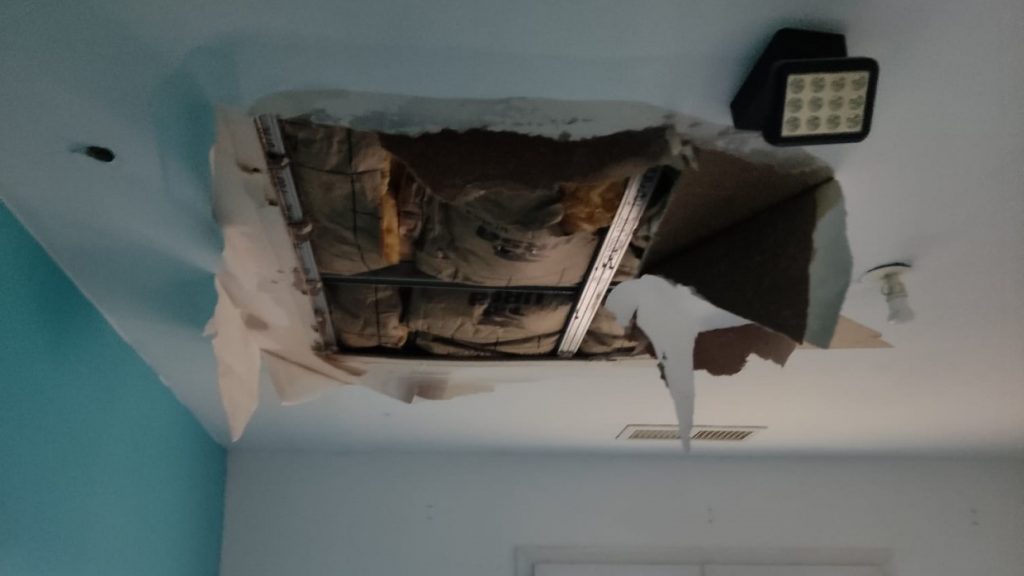 - Dégât des eaux dans la chambre d'un enfant et le salon suite à un épisode cévenol, avec effondrement du faux plafond en placoplatre.